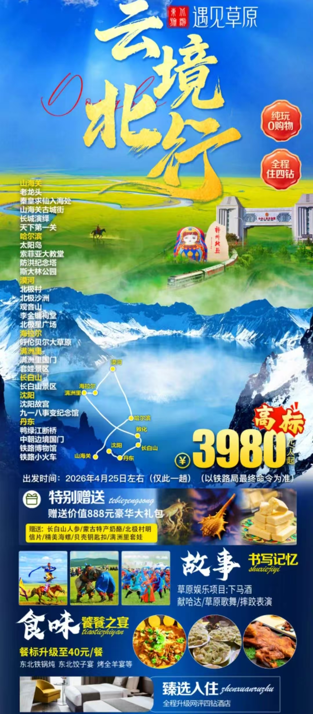 • ?-6月北境山沟뀑山关、哈滨、漠沟뀁北极村、v拉尔、满z里、呼伦贝大草原、长白山、沈队뀁丹东万人游东北I专列15日游
